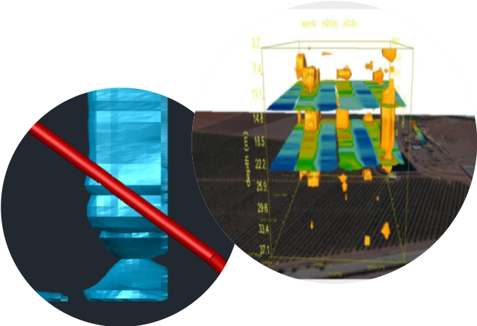 Vuelos con un dron de alta gama que transporta un sistema geofísico GPR (Ground Penetrating Radar), el cual permite detectar acuíferos (aguas subterráneas) y cuerpos bajo tierra como tuberías, rocas, etc. Además, hace posible detectar anomalías, como fugas en estanques, tuberías y tranques. Esta tecnología permite una medición a nivel de subsuelo de hasta 120 metros de profundidad.