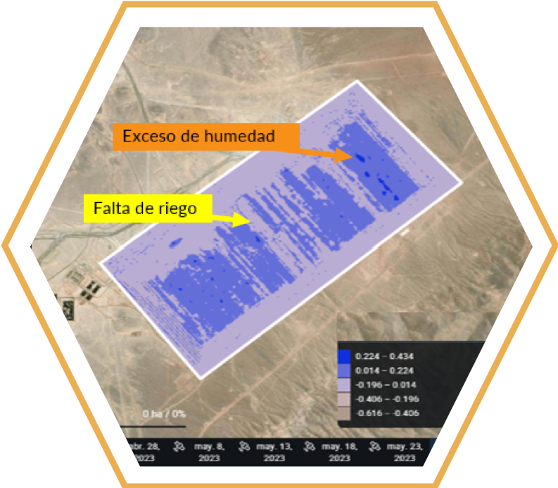 At BM, we have satellite images generated every 3 to 5 days, with a resolution of 1.5 meters, which allows for the analysis of leach pile irrigation and even determining areas with excess moisture that jeopardize pile stability and irrigation process failure.