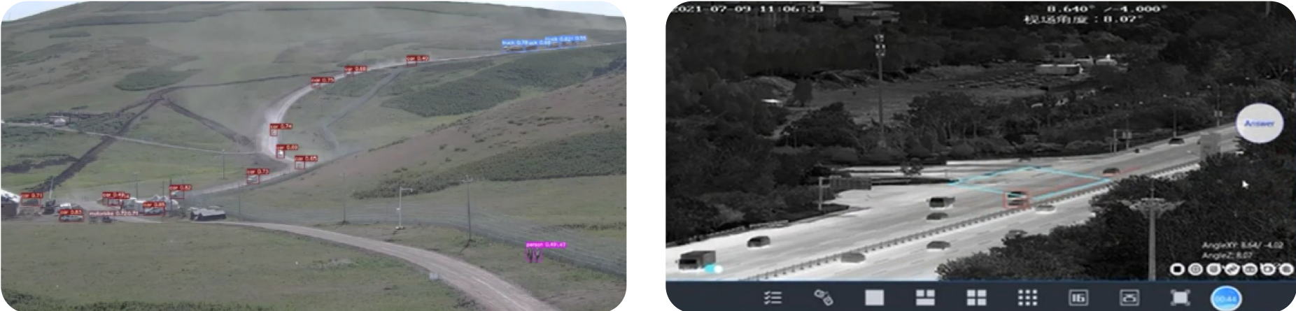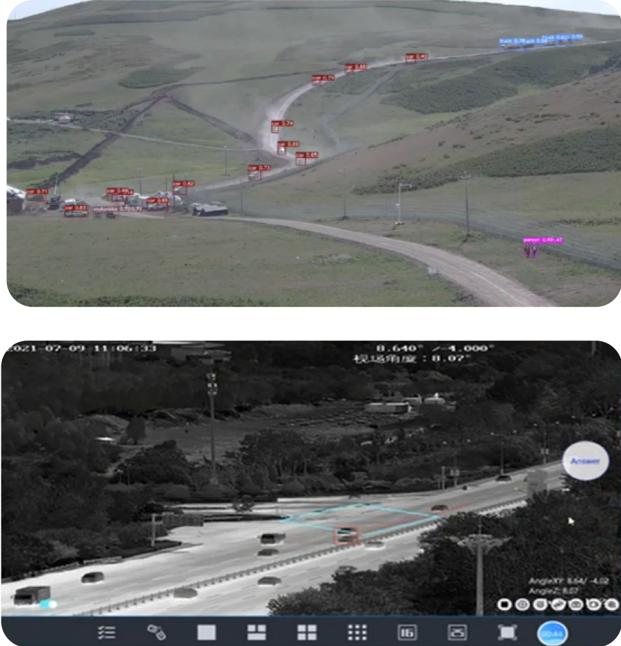 High-performance cameras with up to 20 km range and AI and video analytics capabilities for automated detection, identification, and tracking of targets.